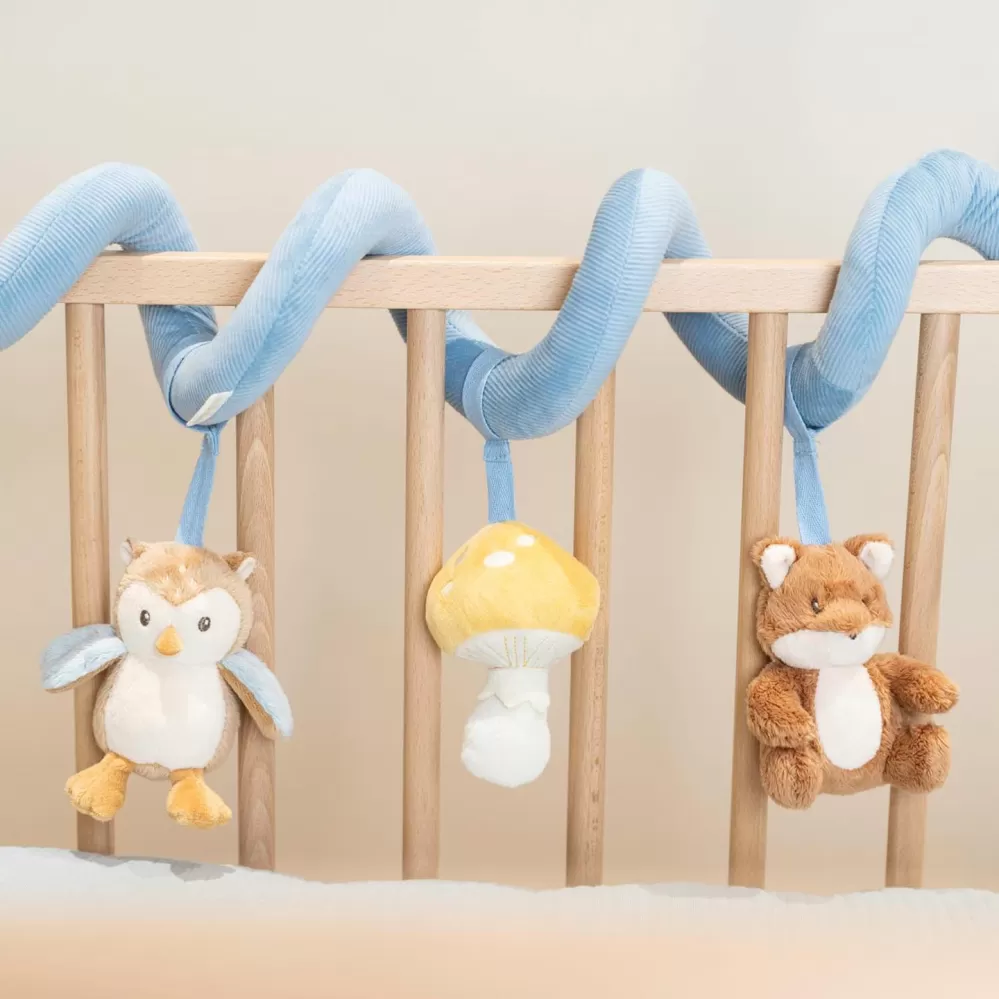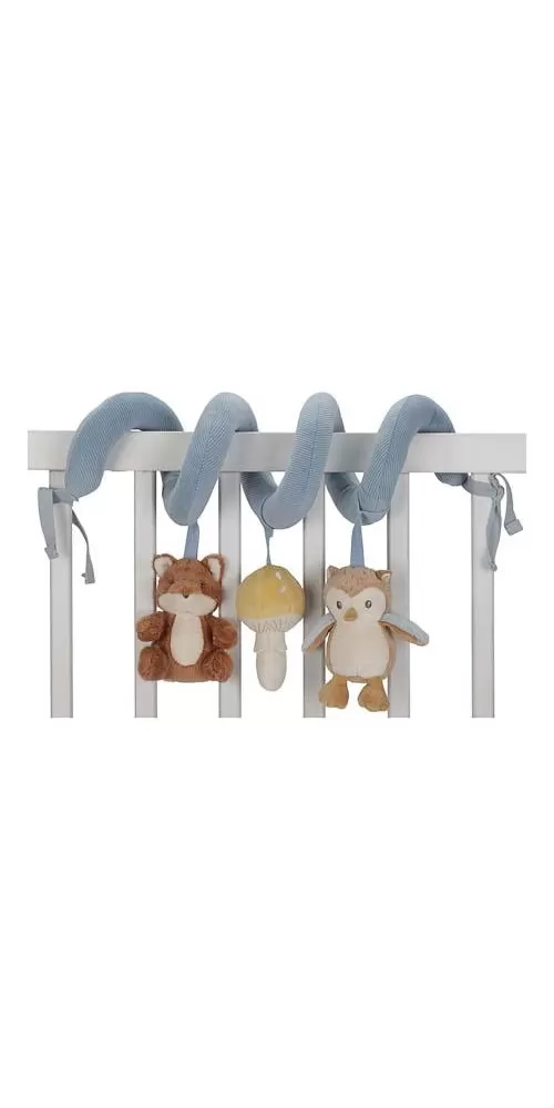 Textilní spirála se zavěšenými hračkami v podobě lišky, sovy a houbičky zabaví vaše miminko v postýlce, kočárku i v autosedačce. Měkké hračky vyrobené z jemného plyše chrastí, šustí a nabízí různé textury pro zkoumání. Hračky stimulují koordinaci ruka / oko dítěte.