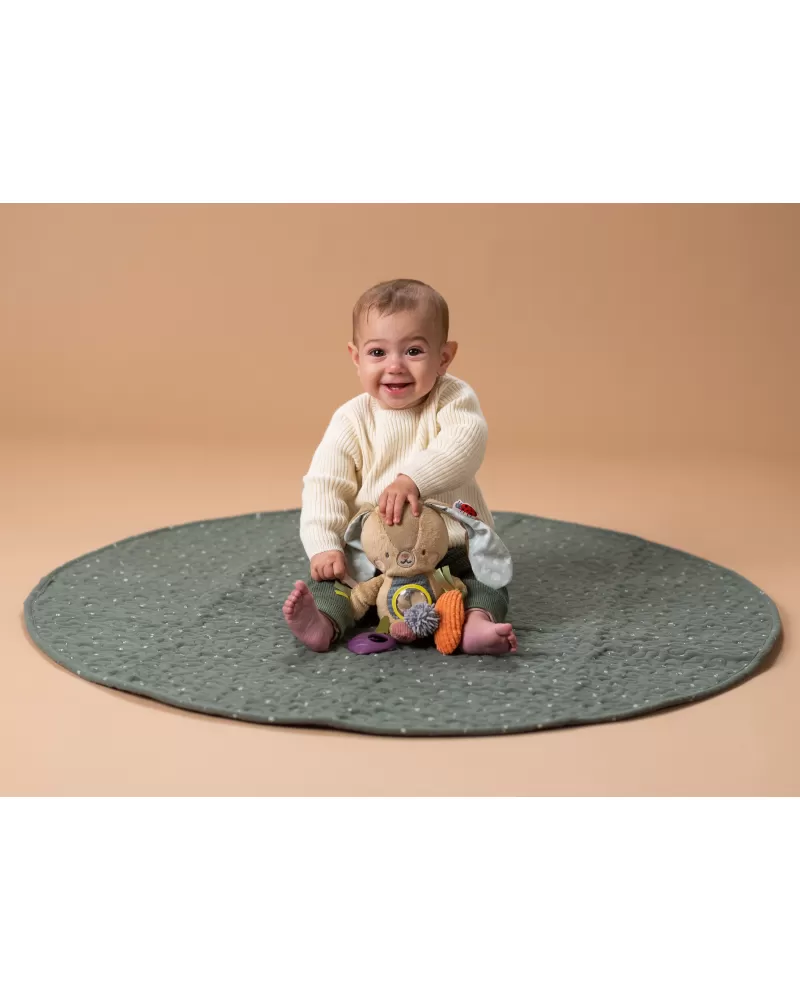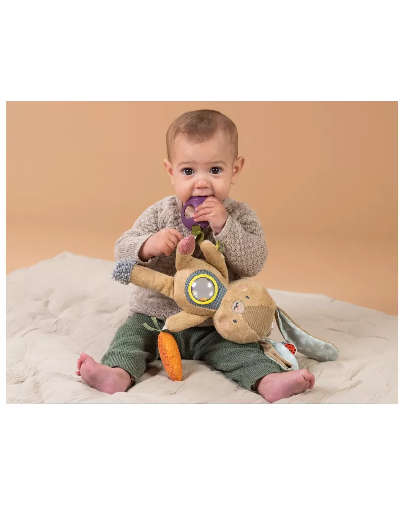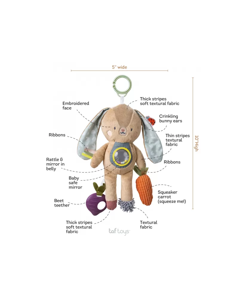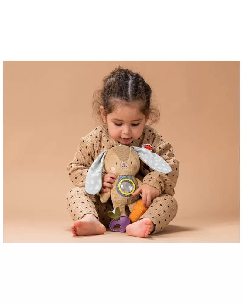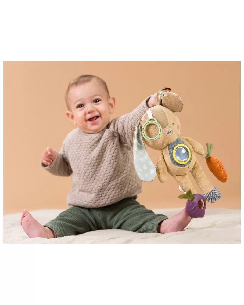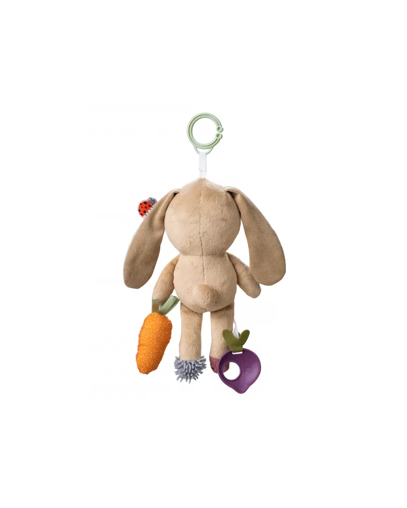 Hračka v podobě roztomilého králíčka Jenny se snadno zavěsí na postýlku, kočárek, autosedačku apod. Hračka chrastí, šustí a nabízí různorodé textury i kousátko pro zkoumání rukama i ústy dítěte.